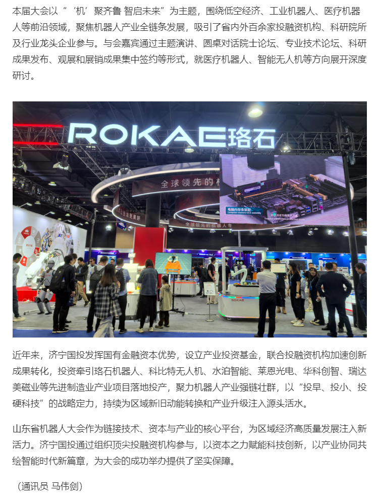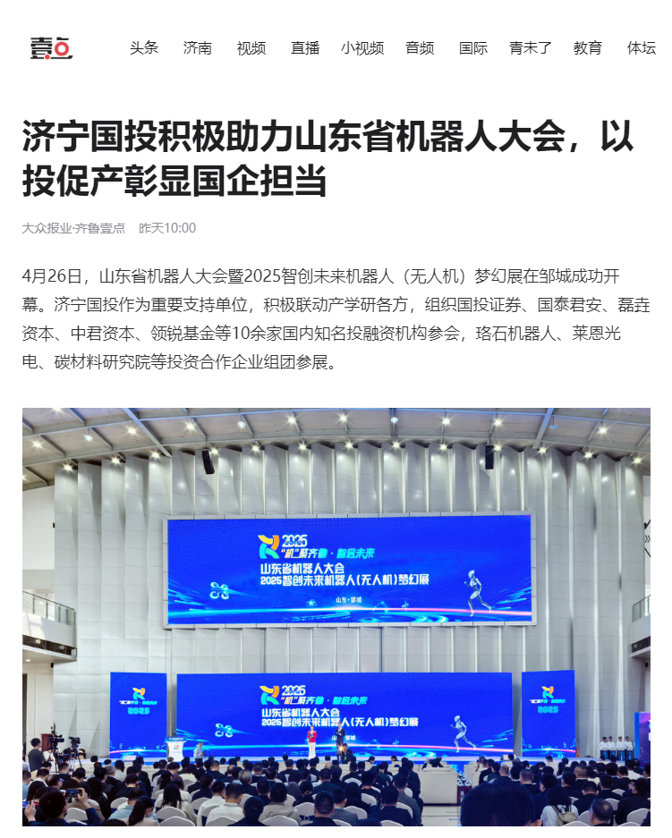 《齐鲁晚报·齐鲁壹点》| 济宁国投积极助力山东省机器人大会,以投促产彰显国企担当