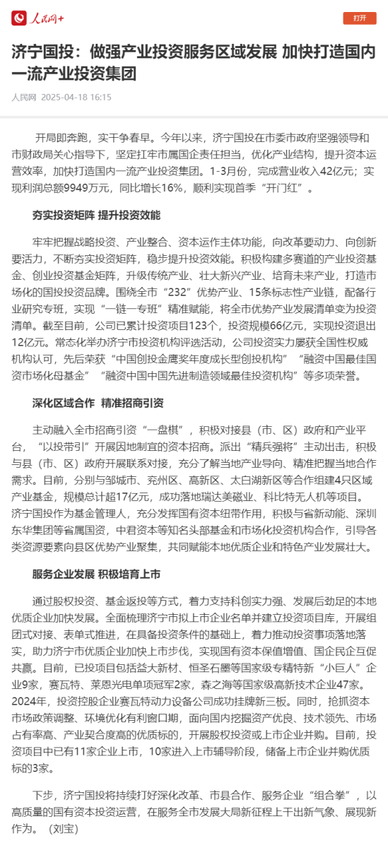 《人民网》| 济宁国投:做强产业投资服务区域发展 加快打造国内一流产业投资集团