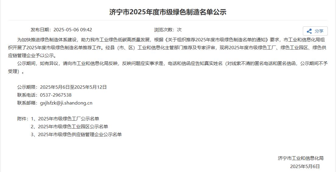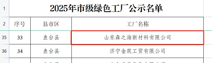 近日,济宁市工业和信息化局发布“2025年度市级绿色制造名单公示”通知公告,山东森之海新材料有限公司凭借在绿色制造领域的突出表现,成功获评“2025年市级绿色工厂”称号。